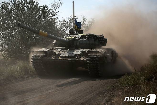 (도네츠크 AFP=뉴스1) 우동명 기자 = 15일(현지시간) 우크라이나 도네츠크에서 병사가 탱크를 타고 러시아 군과 대치하고 있는 전선으로 향하고 있다.