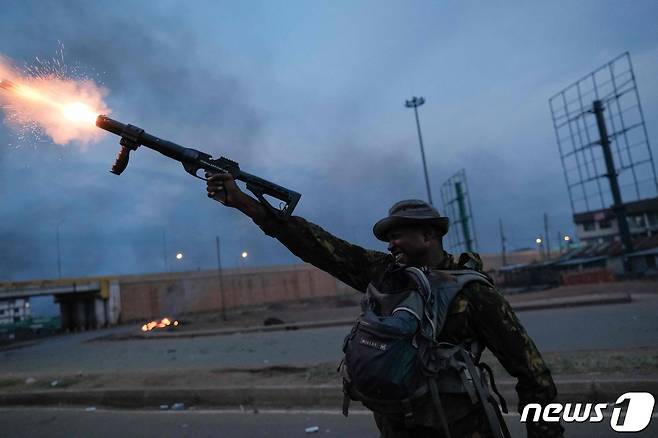 (키수무 AFP=뉴스1) 우동명 기자 = 15일(현지시간) 15일(현지시간) 케냐 키수무에서 대선 결과에 반대하는 시위대를 향해 경찰이 최루탄을 발사하고 있다.