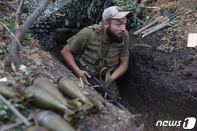 (도네츠크 AFP=뉴스1) 우동명 기자 = 15일(현지시간) 우크라이나 도네츠크에서 병사가 러시아 군과 대치하고 있는 전선의 참호서 순찰을 하고 있다.
