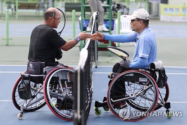 (서울=연합뉴스) 서대연 기자 = 휠체어테니스 선수들이 16일 서울 송파구 올림픽공원 테니스 경기장에서 열린 2022 서울 코리아오픈 국제휠체어테니스대회에서 경기가 끝난 후 인사하고 있다. 2022.8.16