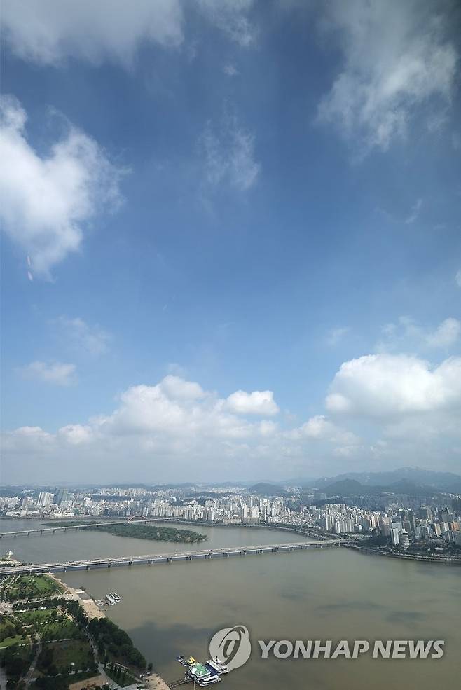 (서울=연합뉴스) 이지은 기자 = 16일 오전 서울 여의도 63스퀘어 전망대에서 맑은 하늘과 흙탕물로 변한 한강이 보이고 있다. 2022.8.16