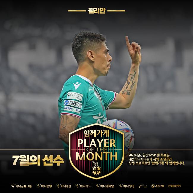 [인터풋볼] 박지원 기자 = 대전하나시티즌의 미드필더 윌리안이 팬들이 뽑은'함께가게 7월 MVP'로 선정됐다.