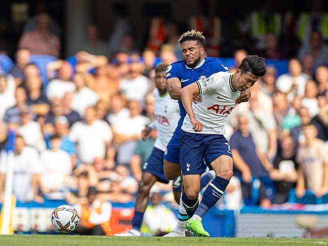 | ▲ 2022년 8월 14일 영국 런던에서 열린 첼시와 토트넘 홋스퍼의 잉글랜드 프리미어리그 경기에서 첼시의 리스 제임스(왼쪽)가 토트넘의 손흥민을 끌어내고 있다. 경기는 2-2 무승부로 끝났다. |