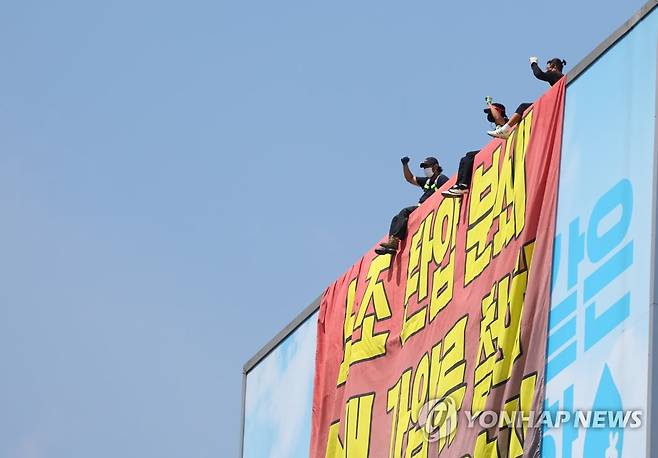 (서울=연합뉴스) 김도훈 기자 = 16일 하이트진로 측에 손해배상 소송·업무방해 가처분신청 철회, 해고 조합원 복직, 운송료 현실화 등을 요구하며 서울 강남구 하이트진로 본사 옥상 점거 농성을 벌이고 있는 전국민주노동조합총연맹(민주노총) 공공운수노조 화물연대 소속 조합원들이 현수막을 내건 대형 옥외광고판에 걸터앉아 있다. 2022.8.16
