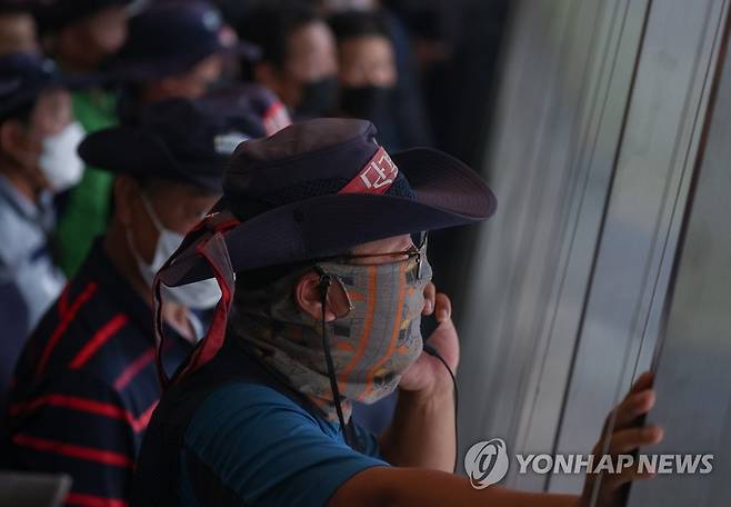 (서울=연합뉴스) 김도훈 기자 = 16일 하이트진로 측에 손해배상 소송·업무방해 가처분신청 철회, 해고 조합원 복직, 운송료 현실화 등을 요구하며 서울 강남구 하이트진로 본사 로비에서 점거 농성을 벌이고 있는 전국민주노동조합총연맹(민주노총) 공공운수노조 화물연대 소속 조합원들이 건물 앞에서 기자회견을 하고 있는 동료들을 바라보고 있다. 2022.8.16