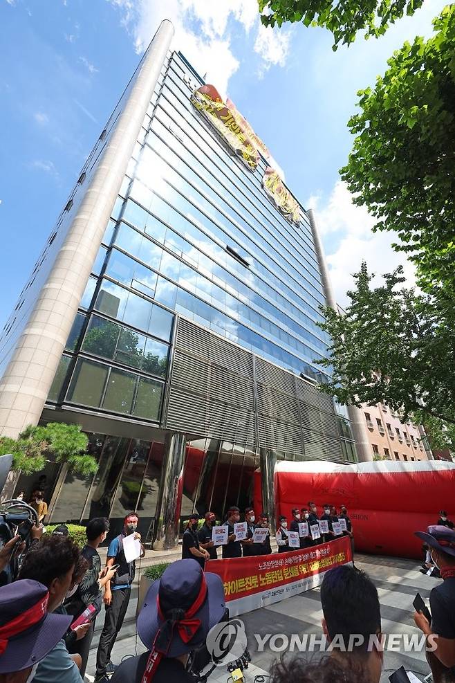 (서울=연합뉴스) 김도훈 기자 = 전국민주노동조합총연맹(민주노총) 공공운수노조 화물연대 소속 조합원들이 16일 하이트진로 측에 손해배상 소송·업무방해 가처분신청 철회, 해고 조합원 복직, 운송료 현실화 등을 요구하며 서울 강남구 하이트진로 본사 앞에서 고공농성돌입 기자회견을 하고 있다. 2022.8.16