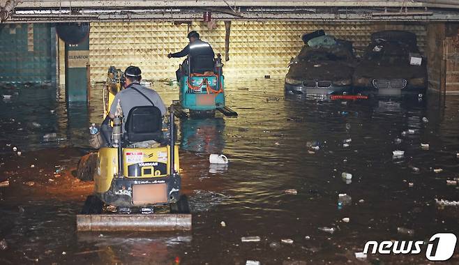 (성남=뉴스1) 조태형 기자 = 16일 지난 폭우로 경기 성남시 분당구의 한 오피스텔 지하 주차장이 침수돼 복구 작업이 한창이다. 오피스텔 관계자에 따르면 차량 100여 대가 미처 주차장을 빠져나오지 못해 침수된 것으로 알려졌다. 2022.8.16/뉴스1