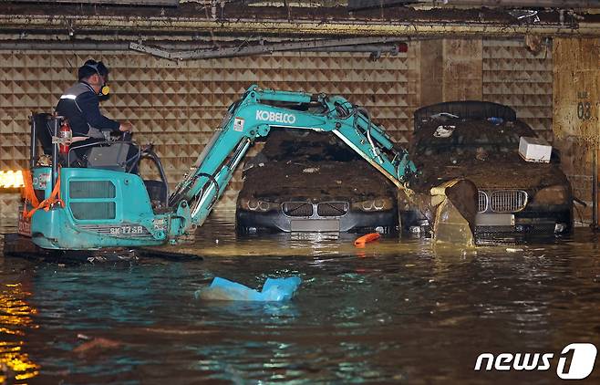 (성남=뉴스1) 조태형 기자 = 16일 지난 폭우로 경기 성남시 분당구의 한 오피스텔 지하 주차장이 침수돼 복구 작업이 한창이다. 오피스텔 관계자에 따르면 차량 100여 대가 미처 주차장을 빠져나오지 못해 침수된 것으로 알려졌다. 2022.8.16/뉴스1