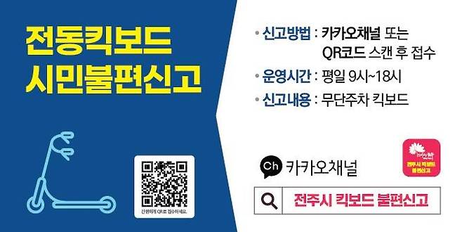 전북 전주시가 거리에 아무렇게나 방치돼 통행 안전을 위협하는 전통킥보드 불편 신고를 카카오톡 채널로 접수, 신속한 처리에 나섰다.