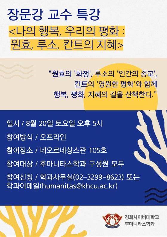 경희사이버대학교(총장 변창구) 후마니타스학과는 오는 8월 20일(토) 네오르네상스관에서 2학기 오리엔테이션 및 ‘나의 행복, 우리의 평화 : 원효, 루소, 칸트의 지혜’를 주제로 특강을 진행한다.