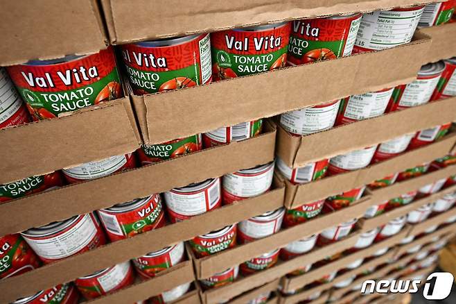 (버뱅크 AFP=뉴스1) 손승환 기자 = 15일(현지시간) 미국 캘리포니아주 버뱅크에 있는 월마트 매장에서 토마토 소스 캔이 판매되고 있다. 한편 △팬데믹을 우려한 공격적인 소비자 지출 △세계적인 공급망 혼란 △국내 노동자 부족 △우크라이나 전쟁 등에 힘입어 미국의 6월 물가상승률은 9.1%를 기록했다. 40년 만에 가장 높은 수치다.