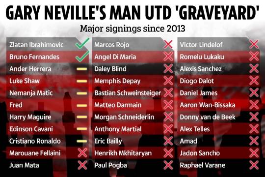 영국 매체 '더 선'은 16일(한국시간) "네빌은 지난 10년 동안 맨유가 영입한 선수 중 성공은 두 명뿐이라고 언급했다. 맨유를 '축구 선수들의 무덤'이라고 불렀다"라고 전했다. 네빌은 2013년 이후 맨유가 영입한 33명의 선수를 평가했다. 3순위 골키퍼나 유망주는 제외됐다.
