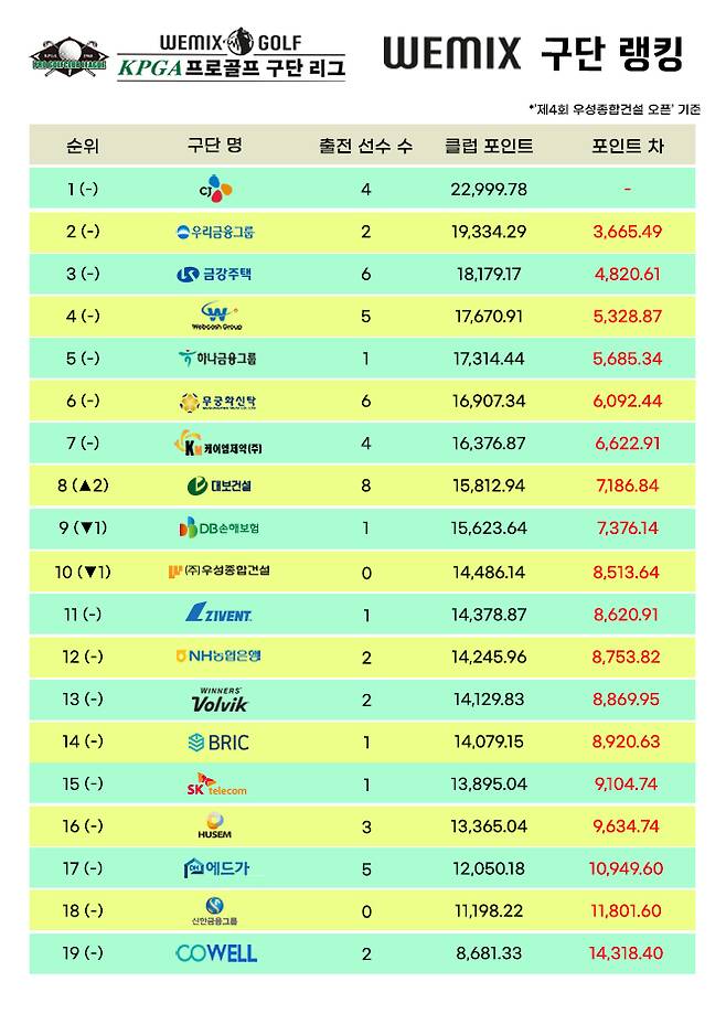 이 대회에 배용준(22), 정찬민(23), 김민규(21), 최승빈(21) 등 4명을 출전시킨 CJ가 누적 2만 2999.78포인트로 구단랭킹 선두를 굳건히 유지한 가운데 대보건설과 DB손해보험이 8위로 올라선 우성종합건설의 도약에 순위가 1계단씩 밀려 각각 9위와 10위를 차지했을 뿐 나머지 15개 구단의 순위는 변동이 없었다.