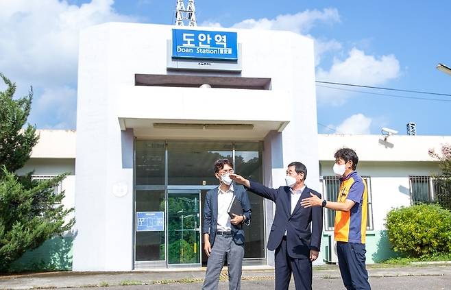 [증평=뉴시스] 강신욱 기자 = 16일 오후 충북 증평군 도안면 화성리 충북선 도안역을 방문한 이재영(가운데) 증평군수가 군청 도시교통과장, 코레일 직원과 함께 역을 둘러보고 있다. (사진=증평군 제공) 2022.08.16. photo@newsis.com
