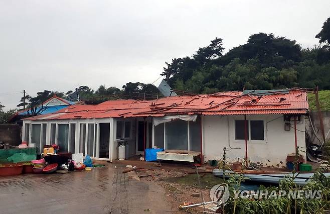 (정읍=연합뉴스) 16일 전북 정읍시 이평면 한 주택 지붕이 강한 바람에 파손돼 있다. 이날 정읍에는 순간풍속 8m/s 이상의 바람이 불고 집중 호우가 쏟아졌다. 2022.8.16 [전북도 제공. 재판매 및 DB금지]