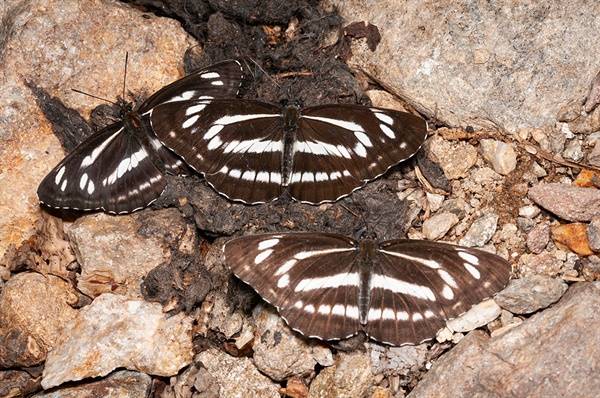 | ▲ 짐승똥을 먹고 있는 세줄나비들. 왼쪽이 높은산세줄나비, 오른쪽 두 마리는 세줄나비. |