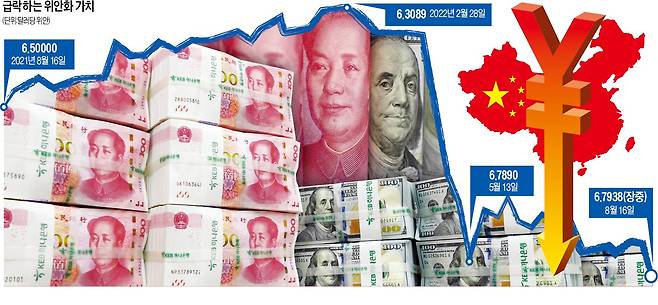 지난 석 달여 동안 횡보하던 위안화 환율이 급등하고 있다. 중국 경제가 하반기에도 저성장을 이어갈 것이란 전망이 커지면서다. 내수 부진과 미·중 갈등 심화 등의 영향으로 경기가 하강 국면에 들어갔다는 분석이 나온다. 버팀목 역할을 하던 수출도 활력이 떨어질 조짐을 보이고 있다.
