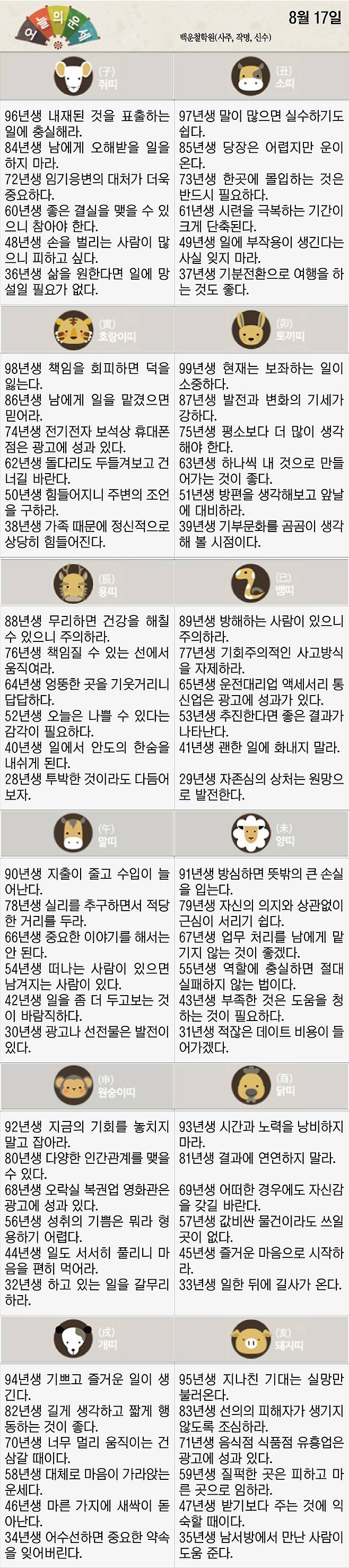 [재미로 보는 오늘의 운세] 8월 17일 (수요일)