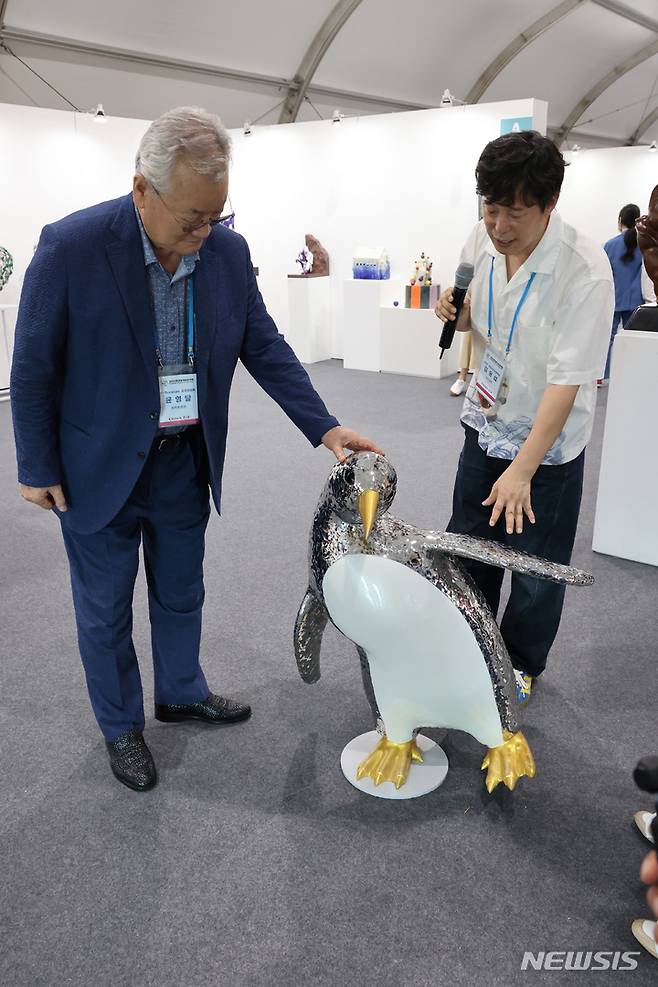 [서울=뉴시스] 박진희 기자 = K-Sculpture 조직위원장 윤영달 크라운해태 회장이 16일 서울 성동구 뚝섬한강공원 음악분수 광장 특설 전시장에서 열린 2022한강조각프로젝트 '낙락유람(樂樂遊覽)' 기자간담회에 참석하여 전시 작품을 살펴보고 올해 두번째 열리는 2022한강조각프로젝트는 ‘지붕 없는 초대형 조각갤러리’를 표방하며 향후 3년간 한강조각프로젝트를 개최하여 K-Sculpture를 국내외 알리고 있다. 전시는 오는 20일부터 9월 21일까지. 2022.08.16. pak7130@newsis.com