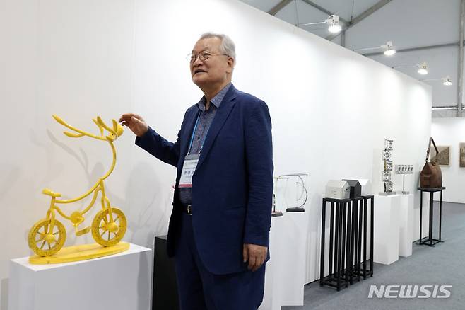 [서울=뉴시스] 박진희 기자 = K-Sculpture 조직위원장 윤영달 크라운해태 회장이 16일 서울 성동구 뚝섬한강공원 음악분수 광장 특설 전시장에서 열린 2022한강조각프로젝트 '낙락유람(樂樂遊覽)' 기자간담회에 참석하여 전시 작품을 살펴보고 올해 두번째 열리는 2022한강조각프로젝트는 ‘지붕 없는 초대형 조각갤러리’를 표방하며 향후 3년간 한강조각프로젝트를 개최하여 K-Sculpture를 국내외 알리고 있다. 전시는 오는 20일부터 9월 21일까지. 2022.08.16. pak7130@newsis.com