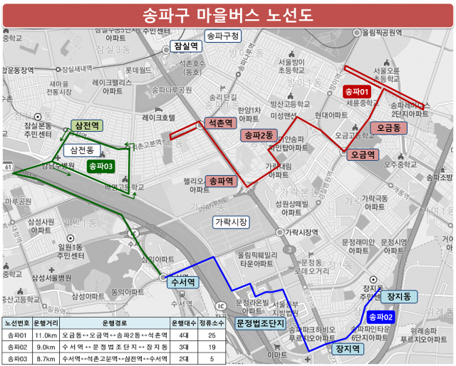 송파구가 운행 예정인 마을버스 노선은 △오금동~송파2동~석촌역까지 운행하는 송파01번 △장지동~문정법조단지~수서역까지 운행하는 송파02번 △수서역~삼전역 사이를 순환 운행하는 송파03번 총 3개 노선이다.