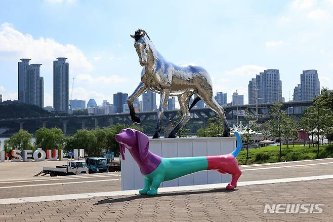 [서울=뉴시스] 박진희 기자 = K-Sculpture 주최하는 2022한강조각프로젝트 '낙락유람(樂樂遊覽)' 개막을 앞둔 16일 서울 성동구 뚝섬한강공원 음악분수 광장 특설 전시장에서 김도훈 작가의 '말 II'와 주후식 작가의 '닥스 훈트' 작품이 전시되어 있다. 올해 두번째 열리는 2022한강조각프로젝트는 ‘지붕 없는 초대형 조각갤러리’를 표방하며 향후 3년간 한강조각프로젝트를 개최하여 K-Sculpture를 국내외 알리고 있다. 2022.08.16. pak7130@newsis.com