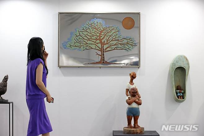 [서울=뉴시스] 박진희 기자 = K-Sculpture 조직위원회 직원이 16일 서울 성동구 뚝섬한강공원 음악분수 광장 특설 전시장에서 열린 2022한강조각프로젝트 '낙락유람(樂樂遊覽)' 기자간담회에 참석하여 전시 작품을 살펴보고 올해 두번째 열리는 2022한강조각프로젝트는 ‘지붕 없는 초대형 조각갤러리’를 표방하며 향후 3년간 한강조각프로젝트를 개최하여 K-Sculpture를 국내외 알리고 있다. 전시는 오는 20일부터 9월 21일까지. 2022.08.16. pak7130@newsis.com