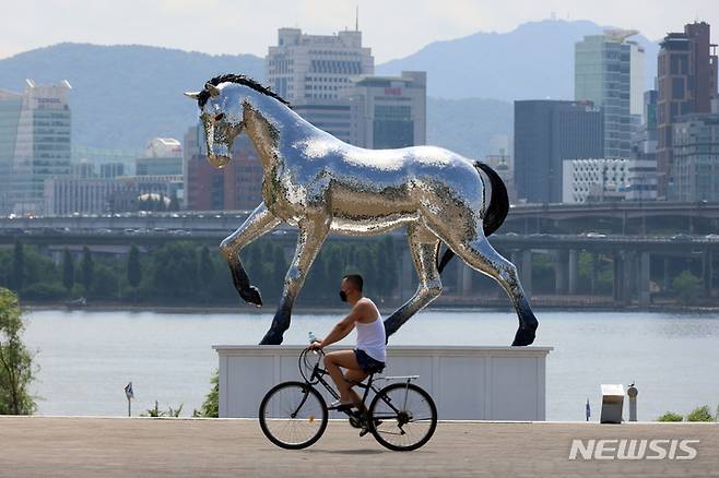 [서울=뉴시스] 박진희 기자 = K-Sculpture 주최하는 2022한강조각프로젝트 '낙락유람(樂樂遊覽)' 개막을 앞둔 16일 서울 성동구 뚝섬한강공원 음악분수 광장 특설 전시장에서 김도훈 작가의 '말 II' 작품이 전시되어 있다. 올해 두번째 열리는 2022한강조각프로젝트는 ‘지붕 없는 초대형 조각갤러리’를 표방하며 향후 3년간 한강조각프로젝트를 개최하여 K-Sculpture를 국내외 알리고 있다. 2022.08.16. pak7130@newsis.com