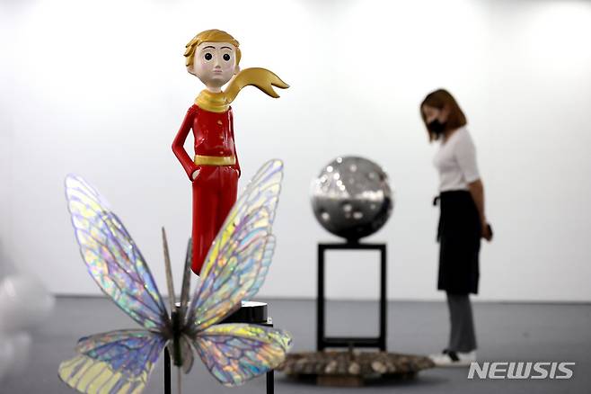 [서울=뉴시스] 박진희 기자 = K-Sculpture 주최하는 2022한강조각프로젝트 '낙락유람(樂樂遊覽)' 개막을 앞둔 16일 서울 성동구 뚝섬한강공원 음악분수 광장 특설 전시장에서 박정기 작가의 '어린왕자' 작품이 전시되어 있다. 올해 두번째 열리는 2022한강조각프로젝트는 ‘지붕 없는 초대형 조각갤러리’를 표방하며 향후 3년간 한강조각프로젝트를 개최하여 K-Sculpture를 국내외 알리고 있다. 2022.08.16. pak7130@newsis.com