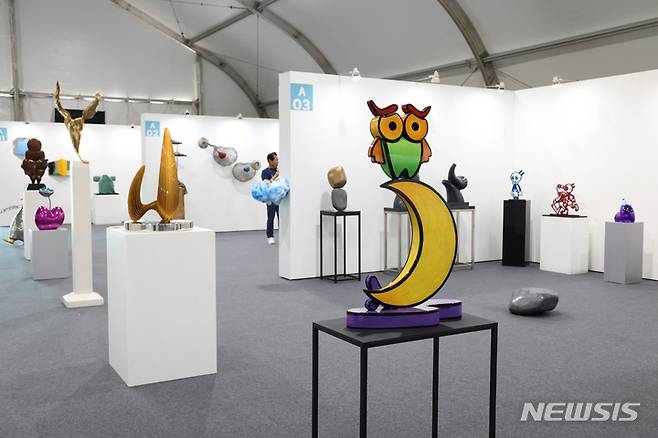 K-Sculpture 조직위원회 직원이 16일 서울 성동구 뚝섬한강공원 음악분수 광장 특설 전시장에서 열린 2022한강조각프로젝트 '낙락유람(樂樂遊覽)' 기자간담회에 참석하여 전시 작품을 살펴보고 올해 두번째 열리는 2022한강조각프로젝트는 '지붕 없는 초대형 조각갤러리'를 표방하며 향후 3년간 한강조각프로젝트를 개최하여 K-Sculpture를 국내외 알리고 있다.
