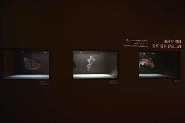 | ▲ ‘개성 만월대 열두 해의 발굴전, 대전’ 전시에서 처음 만나는 ‘개성 만월대 출토 유물 홀로그램’ 고려 청자와 고려 와전 등 출토 유물들이 홀로그램으로 전시되어 있다. |