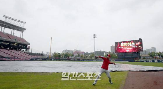 16일 오후 광주 KIA 챔피언스필드에서 열릴 2022 KBO리그 SSG랜더스와 KIA타이거즈 경기가 우천으로 취소되었다. 선발로 예정되었던 SSG 김광현이 방수포 덮인 그라운드 옆에서 캐치볼 하고 있다.