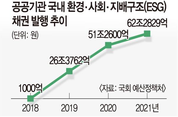 16일 국회 예산정책처에 따르면 공공기관이 국내에서 발행하는 ESG 채권은 해마다 크게 증가하고 있다. ESG 채권은 2018년 1000억원이었지만 지난해 62조2829억원으로 크게 늘었다. 올해도 지난 3월까지 152조4173억원 규모의 ESG 채권이 발행됐다. 단기간에 규모가 크게 증가한 이유는 정부가 공공기관의 ESG 경영을 강조하고 있기 때문이다.