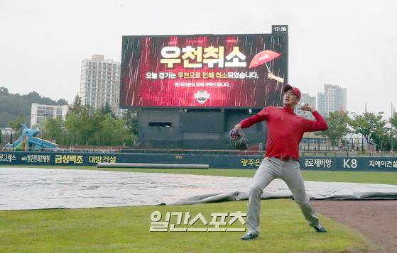 16일 오후 광주 KIA 챔피언스필드에서 열릴 2022 KBO리그 SSG랜더스와 KIA타이거즈 경기가 우천으로 취소되었다. 선발로 예정되었던 SSG 김광현이 방수포 덮인 그라운드 옆에서 캐치볼 하고 있다.