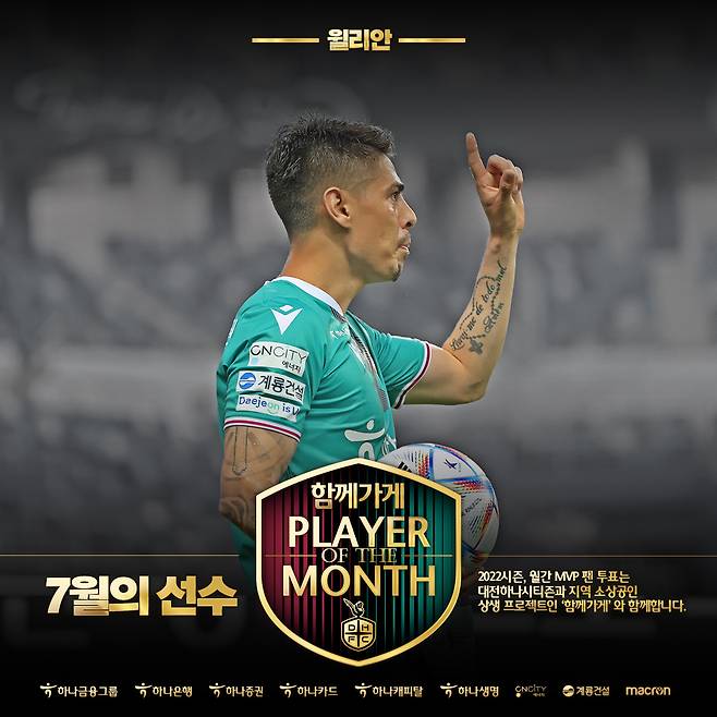 대전하나시티즌의 미드필더 윌리안이 팬들이 뽑은'함께가게 7월 MVP'로 선정됐다.