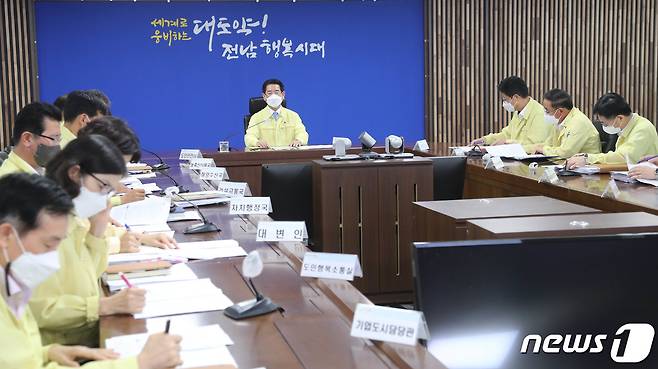 (무안=뉴스1) 전원 기자 = 김영록 전라남도지사가 16일 오후 도청 재난종합상황실에서 실국장 및 소방본부장 등이 참석한 가운데 열린 ‘집중호우 대비 대처상황보고회’에서 “도민의 생명과 재산, 주요시설 보호에 철저히 대비 해줄 것”을 당부하고 있다.(전남도 제공) 2022.8.16/뉴스1