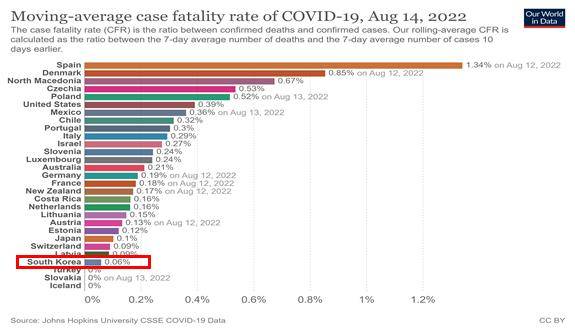 * 인구 10만명당 누적사망자: OECD 평균 211명, 한국 50명(존스홉킨스, ’22.8.14.기준)