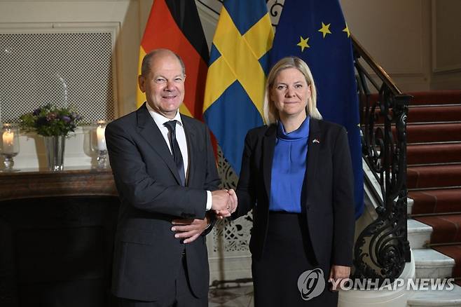 (스톡홀름 EPA=연합뉴스) 막달레나 안데르손 스웨덴 총리(오른쪽)가 16일(현지시간) 수도 스톡홀름에서 올라프 숄츠 독일 총리를 맞이하고 있다. 숄츠 총리는 전날 노르웨이 주최로 오슬로에서 열린 노르딕 정상회의에 참석했다. 2022.08.16