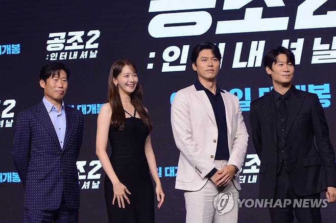 (서울=연합뉴스) 16일 서울 여의도 콘래드 서울 호텔에서 열린 '공조2: 인터내셔날' 제작보고회에서 배우 유해진(왼쪽부터), 임윤아, 현빈, 진선규가 포즈를 취하고 있다. 2022.8.16