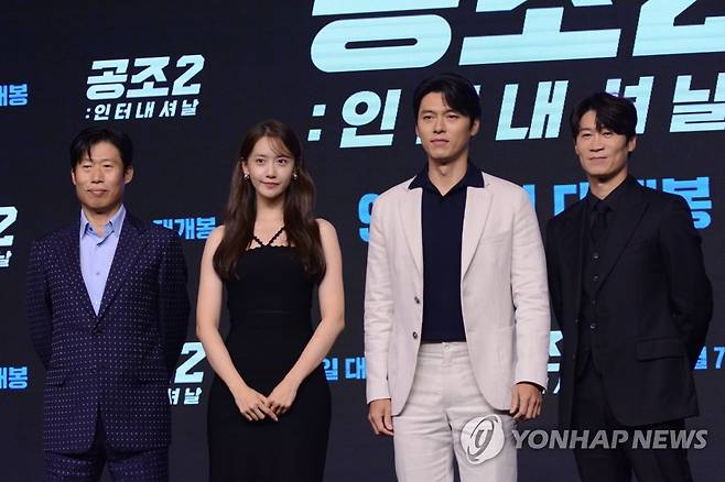 (서울=연합뉴스) 16일 서울 여의도 콘래드 서울 호텔에서 열린 '공조2: 인터내셔날' 제작보고회에서 배우 유해진(왼쪽부터), 임윤아, 현빈, 진선규가 포즈를 취하고 있다. 2022.8.16