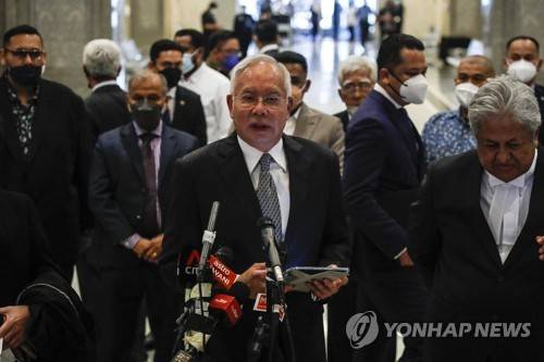 epa10123904 Malaysia's former Prime Minister Najib Razak speaks during a press conference at the Federal Court in Putrajaya, Malaysia, 16 August 2022. Malaysia's Federal Court has dismissed Najib's application to introduce new evidence in his final appeal that would spark a retrial, allegedly proving that the judge who had previously convicted him in the SRC International trial was under a conflict of interest. The Malaysia highest court has scheduled hearings through 26 August 2022 to hear Najib's appeal of his convictions for criminal breach of trust, abuse of power and money laundering over the alleged theft of 4.4 billion Euro from 1Malaysia Development Berhad (1MDB), a state fund he co-founded as premier in 2009. EPA/FAZRY ISMAIL