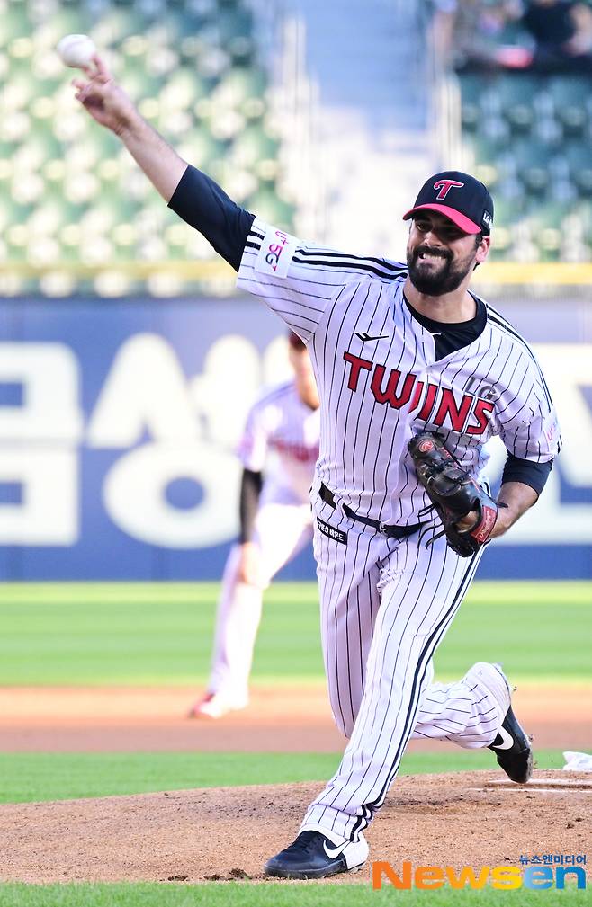 이날 LG 선발 플럿코가 역투를 하고 있다.