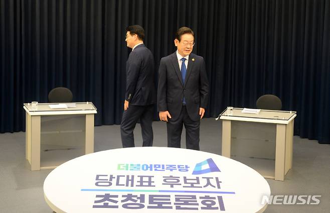 [전주=뉴시스] 김얼 기자 = 더불어민주당 당대표 선거에 나선 박용진 후보와 이재명 후보가 16일 전북 전주시 JTV 전주방송에서 열린 당대표 후보자 초청 토론회 기념촬영을 마치고 자리로 돌아서고 있다. 2022.08.16. pmkeul@newsis.com