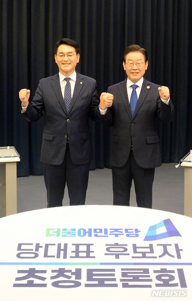 [전주=뉴시스] 김얼 기자 = 더불어민주당 당대표 선거에 나선 박용진 후보와 이재명 후보가 16일 전북 전주시 JTV 전주방송에서 당대표 후보자 초청 토론회를 갖고 기념촬영을 하고 있다. 2022.08.16. pmkeul@newsis.com