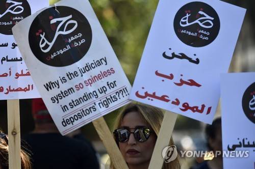 epa10124031 A protester carries placards that read in Arabic 'We are the party of depositors' (R) during a protest in solidarity with the arrested depositor Bassam al-Sheikh Hussein, an armed man who took hostages at a Federal bank, in front of the Justice Palace in Beirut, Lebanon, 16 August 2022. Bassam al-Sheikh Hussein stormed a Hamra-based bank while armed on 11 August, and kept employees and clients as hostages demanding to be given his deposits. Federal Bank announced in a statement on 12 August that it would temporarily close its Hamra branch, where Bassam al-Sheikh Hussein held hostages in an hours-long standoff. EPA/WAEL HAMZEH
