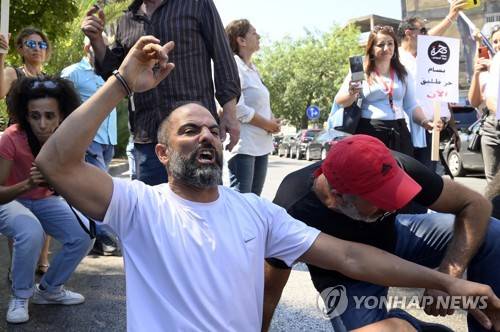 epa10124041 A protester shouts slogans as others block the main road during a protest in solidarity with the arrested depositor Bassam al-Sheikh Hussein, an armed man who took hostages at a Federal bank, in front of the Justice Palace in Beirut, Lebanon, 16 August 2022. Bassam al-Sheikh Hussein stormed a Hamra-based bank while armed on 11 August, and kept employees and clients as hostages demanding to be given his deposits. Federal Bank announced in a statement on 12 August that it would temporarily close its Hamra branch, where Bassam al-Sheikh Hussein held hostages in an hours-long standoff. EPA/WAEL HAMZEH