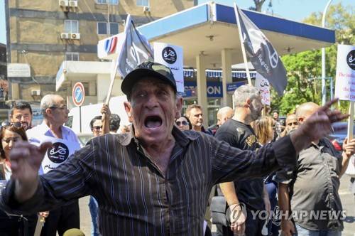 epa10124040 A protester shouts slogans as others block a road during a protest in solidarity with the arrested depositor Bassam al-Sheikh Hussein, an armed man who took hostages at a Federal bank, in front of the Justice Palace in Beirut, Lebanon, 16 August 2022. Bassam al-Sheikh Hussein stormed a Hamra-based bank while armed on 11 August, and kept employees and clients as hostages demanding to be given his deposits. Federal Bank announced in a statement on 12 August that it would temporarily close its Hamra branch, where Bassam al-Sheikh Hussein held hostages in an hours-long standoff. EPA/WAEL HAMZEH