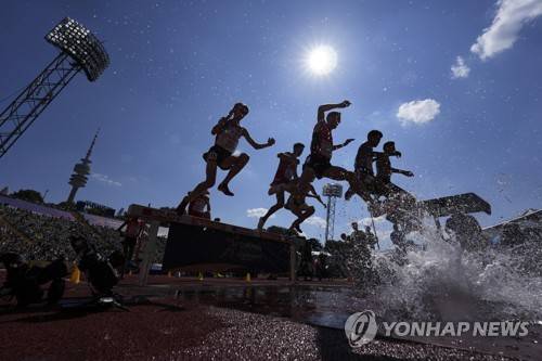 Athletes compete in a Men's 3000 meters steeplechase heat during the athletics competition in the Olympic Stadium at the European Championships in Munich, Germany, Tuesday, Aug. 16, 2022. (AP Photo/Matthias Schrader)