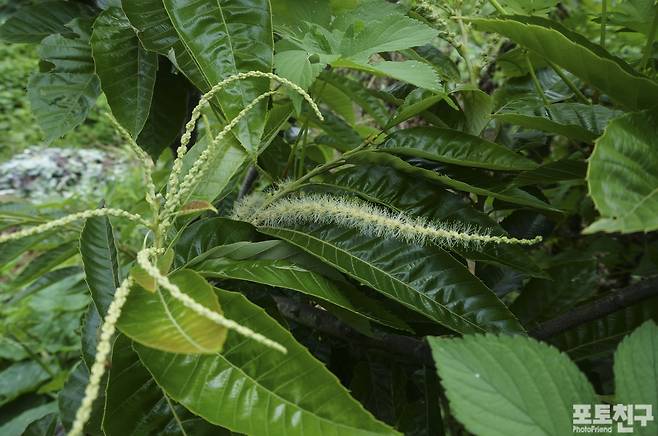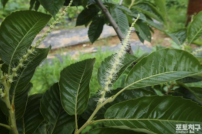 밤송이의 밤은 곧 익을 거 같은데 밤꽃이 피었습니다.
