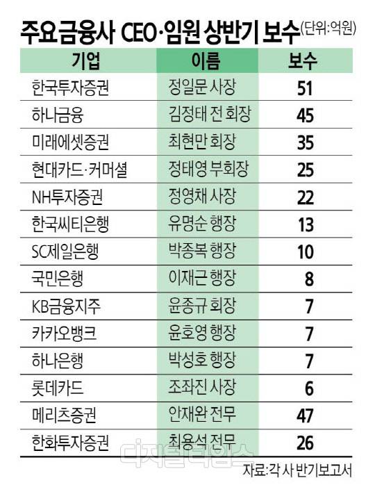 [주요기업 CEO 상반기 연봉] 정일문 한투증권 사장 51억으로 금융권 최고